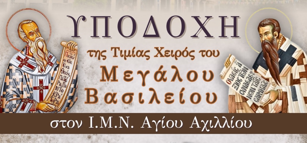 Με πολλή χαρά και ιδιαίτερη τιμή, τη Δευτέρα 16 Φεβρουαρίου, στον Ιερό  Μητροπολιτικό Ναό του Αγίου Αχιλλίου, ο Λαρισαϊκός λαός, με επικεφαλής τον Σεβασμιώτατο Μητροπολίτη Λαρίσης και Τυρνάβου κ. Ιερώνυμο, θα υποδεχτεί την Τιμία δεξιά Χείρα του Μεγάλου Βασιλείου, του σπουδαίου Οικουμενικού Διδασκάλου της Εκκλησίας μας, που ως πολύτιμος θησαυρός φυλάσσεται στην Ιερά Σύνοδο της Εκκλησίας της Ελλάδος και πολλές φορές ευωδιάζει στέλνοντας ποικίλα μηνύματα. Το πρόγραμμα των Ιερών Ακολοθιών κατά την παραμονή του Ιερού Λειψάνου στον Ιερό Ναό έχεις ως εξης: