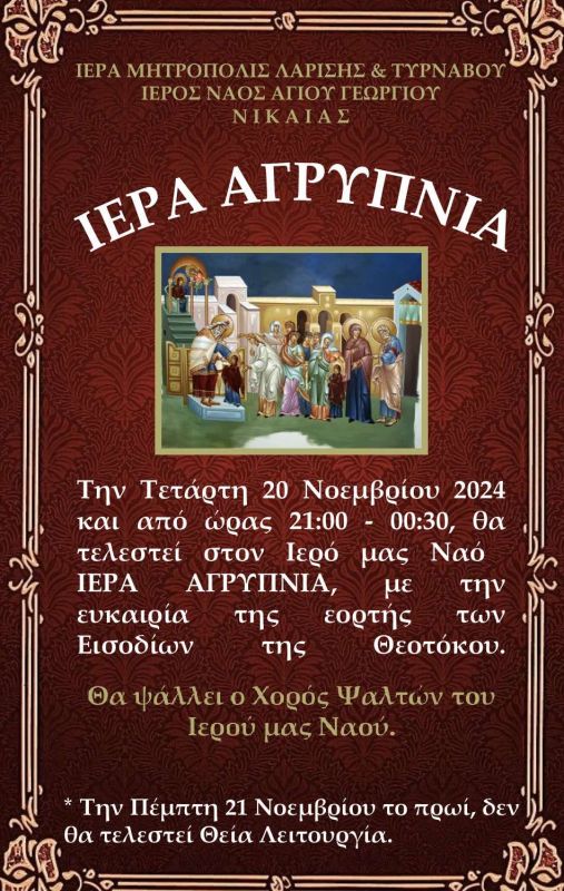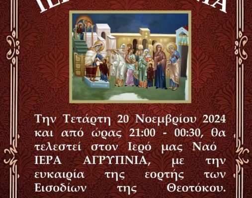 Την Τετάρτη 20 Νοεμβρίου και από ώρας 21:00 – 00:30, θα τελεστεί Ιερά Αγρυπνία στον Ιερό Ναό του Αγίου Γεωργίου Νίκαιας, με την ευκαιρία της εορτής των Εισοδίων της Θεοτόκου.