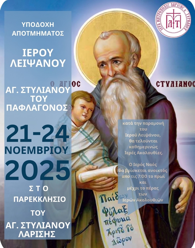 • 5.00 μ.μ.: Υποδοχή αποτμήματος Ιερού Λειψάνου του Αγίου από την Ιερά Μονή Κορώνας και στη συνέχεια θα τελεστεί Μέγας πανηγυρικός Αρχιερατικός Εσπερινός, χοροστατούντος του Σεβ. Μητροπολίτου Λαρίσης και Τυρνάβου κ. Ιερωνύμου.