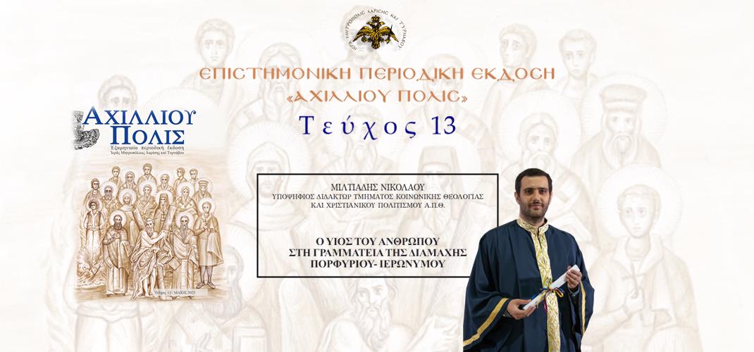ΤΑ ΝΕΑ ΤΗΣ ΜΗΤΡΟΠΟΛΗΣ (12/08/2025)(15/08/2025) Μιλτιάδης Νικολάου: «Ο υιός του ανθρώπου στη γραμματεία της διαμάχης Πορφυρίου-Ιερωνύμου». Posted By: imlarisis Άρθρο του Υποψηφίου Διδάκτορος Τμήματος Κοινωνικής Θεολογίας και Χριστιανικού Πολιτισμού Α.Π.Θ., κ. Μιλτιάδη Νικολάου. Διαβάστε το άρθρο με ένα κλικ στην εικόνα.
