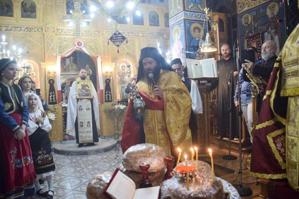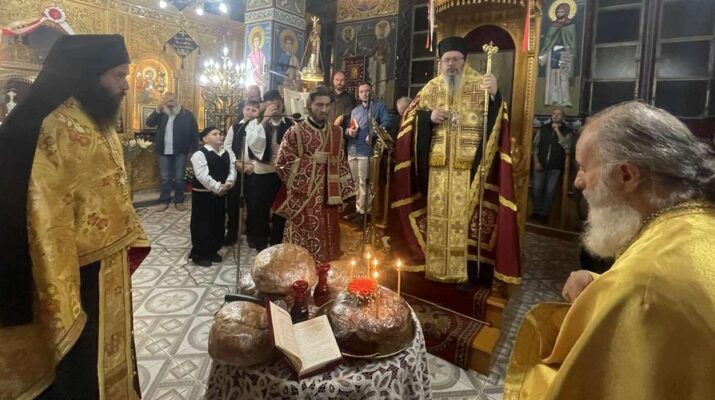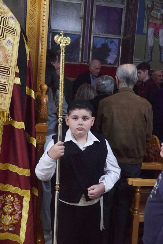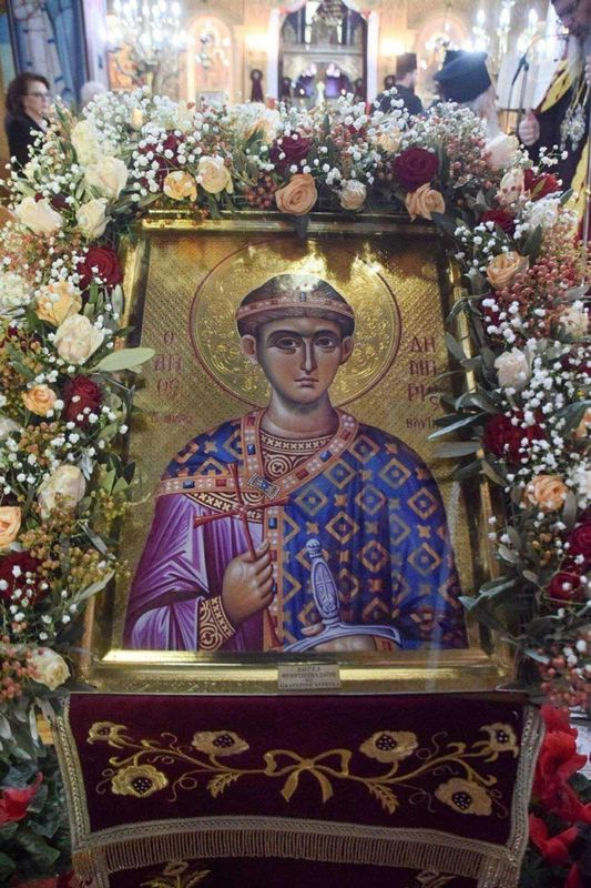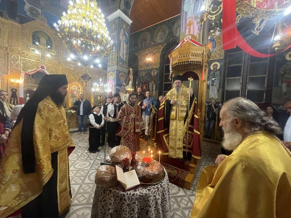 Στον πανηγυρίζοντα Ιερό Ναό, τον οποίον κατέκλυσαν πλήθη λαού από το χωριό και τις γύρω περιοχές, με εμφανή την παρουσία των παιδιών και των νέων του τόπου, μάλιστα δε κάποιων εξ’αυτών ενδεδυμένων με τις παραδοσιακές στολές τους, τελέστηκε ο μέγας πανηγυρικός αρχιερατικός εσπερινός προς τιμήν του Αγίου Δημητρίου, παρουσία του Δημάρχου Τυρνάβου κ. Στέλιου Τσικριτσή. Καλλικέλαδοι Ιεροψάλτες απέδωσαν τόσο τους αναστάσιμους ύμνους, όσο και τα εόρτια του Μεγαλομάρτυρα Αγίου Δημητρίου, δημιουργώντας κλίμα πανηγυρικό και συνάμα προσευχητικό.