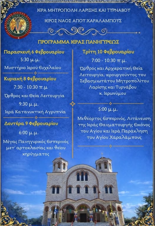 Το πρόγραμμα των λατρευτικών εκδηλώσεων του Ιερού Ναού Αγίου Χαραλάμπους Λαρίσης, έχει ως εξής: