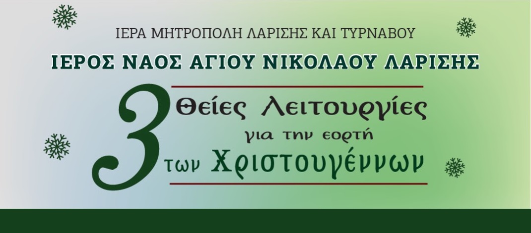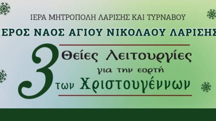 Από την Ιερά Μητρόπολη Λαρίσης και Τυρνάβου ανακοινώνονται οι ώρες για τις τρεις συνολικά Θείες Λειτουργίες την ημέρα των Χριστουγέννων που θα τελεστούν στον Ιερό Ναό του Αγίου Νικολάου, προκειμένου να διευκολυνθούν οι πιστοί Χριστιανοί.