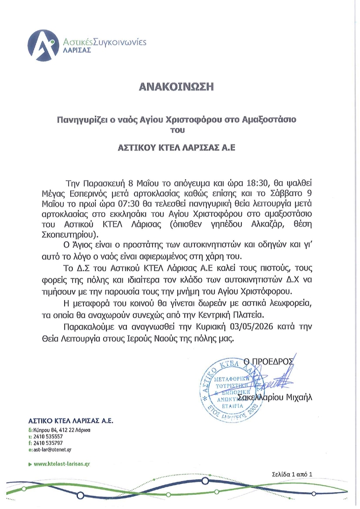 • Το Αστικό ΚΤΕΛ τιμά τον προστάτη του Άγιο Χριστοφόρο. By imlarisis on Απρ 30, 2026