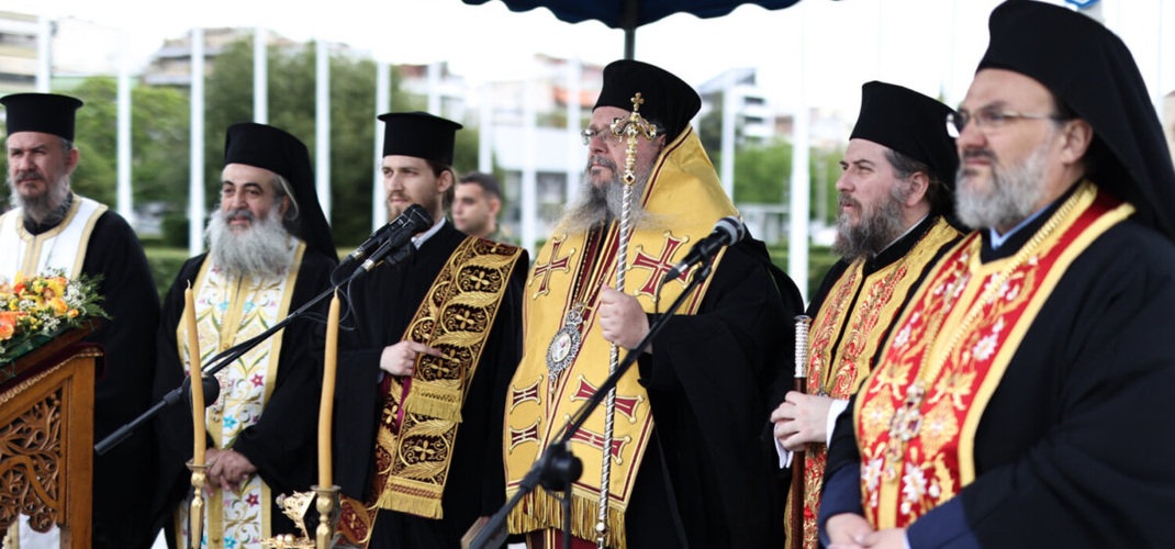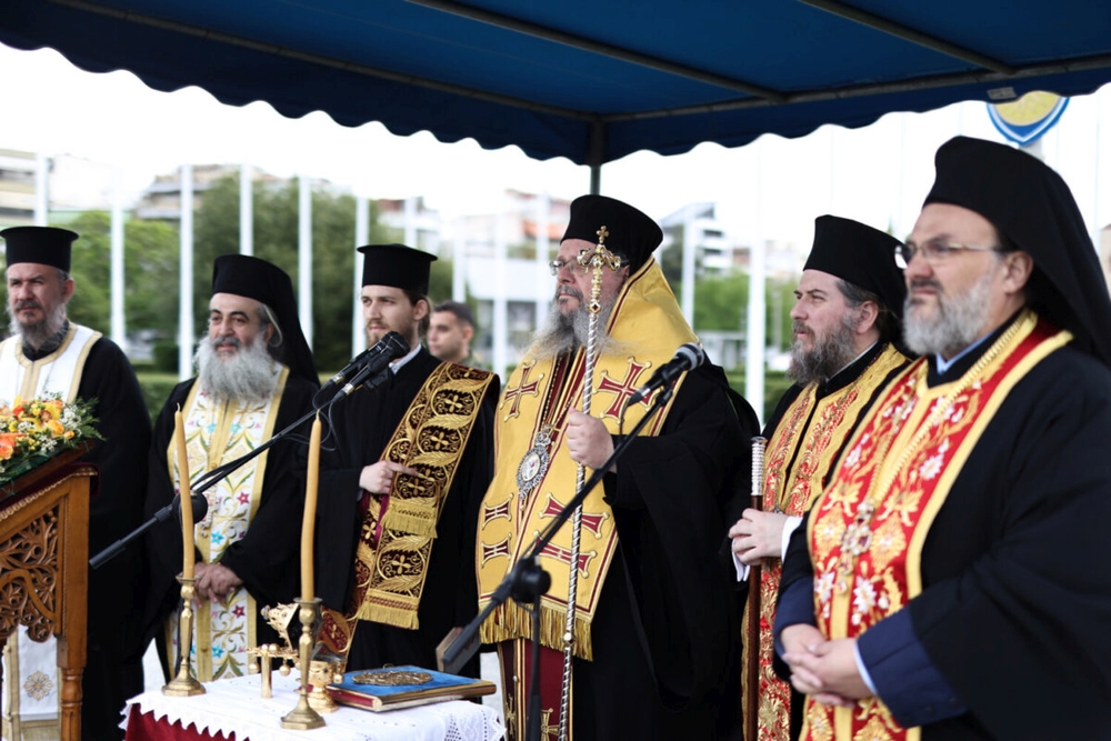 Τη δοξολογία στο χώρο προ του Ηρώου τέλεσε ο Σεβασμιώτατος Μητροπολίτης Λαρίσης και Τυρνάβου κ. Ιερώνυμος.