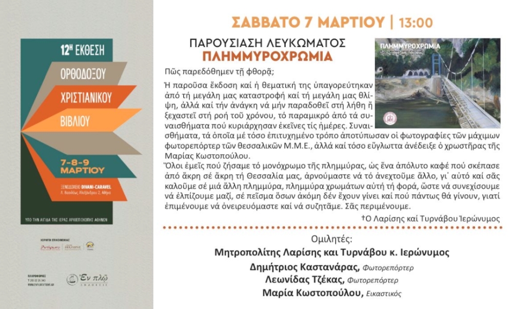 Σας περιμένουμε όλους, στην παρουσίαση του λευκώματος «ΠΛΗΜΜΥΡΟΧΡΩΜΙΑ», το Σάββατο 7 Μαρτίου 2026 και ώρα 13:00, στο ξενοδοχείο ΚΑΡΑΒΕΛ Αθηνών.