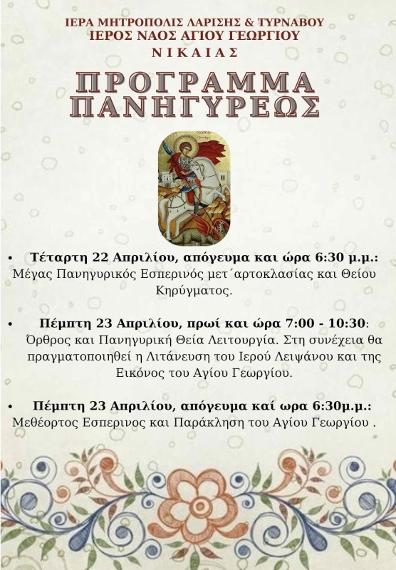 Φέρεται εις γνώσιν των ευσεβών Χριστιανών ότι την Πέμπτη 23 Απριλίου, που η Αγία μας Εκκλησία εορτάζει την μνήμη του Αγίου Γεωργίου του Τροπαιοφόρου, εορτάζει μεγαλοπρεπώς ο φερώνυμος Ναός του Αγίου στην Κωμόπολη της Νίκαιας. Οι Ιερές πανηγυρικές Ακολουθίες θα τελεσθούν, κατά το ακόλουθο πρόγραμμα: