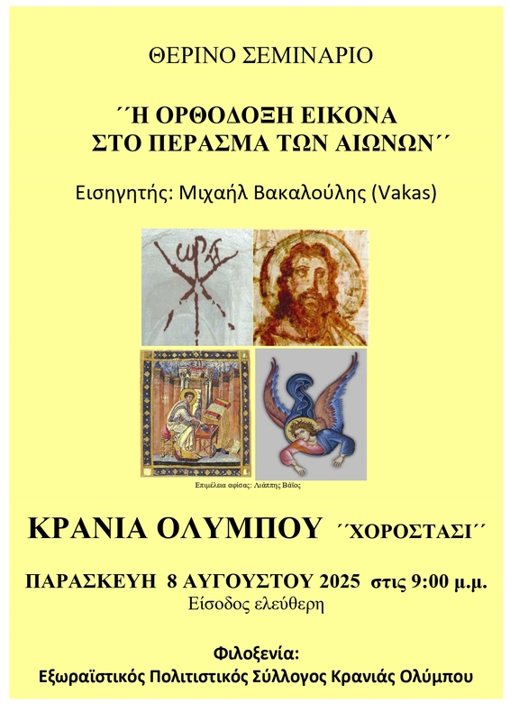 Θερινό σεμινάριο, με τίτλο: «Η ορθόδοξη εικόνα στο πέρασμα των αιώνων», θα πραγματοποιηθεί την Παρασκευή 8 Αυγούστου 2025, στις 9:00 μ.μ., στην Κρανιά Ολύμπου, στη θέση «χοροστάσι» με ελεύθερη είσοδο.