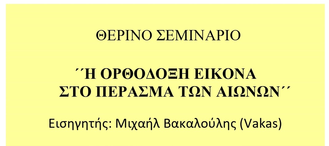 Την εισήγηση του σεμιναρίου θα πραγματοποιήσει ο εικαστικός Μιχαήλ Βακαλούλης (Vakas), όπου θα αναπτύξει την πορεία της Ορθόδοξης εικονογράφησης από τα πρωτοχριστιανικά χρόνια έως τα σύγχρονα εικονογραφικά μοτίβα.