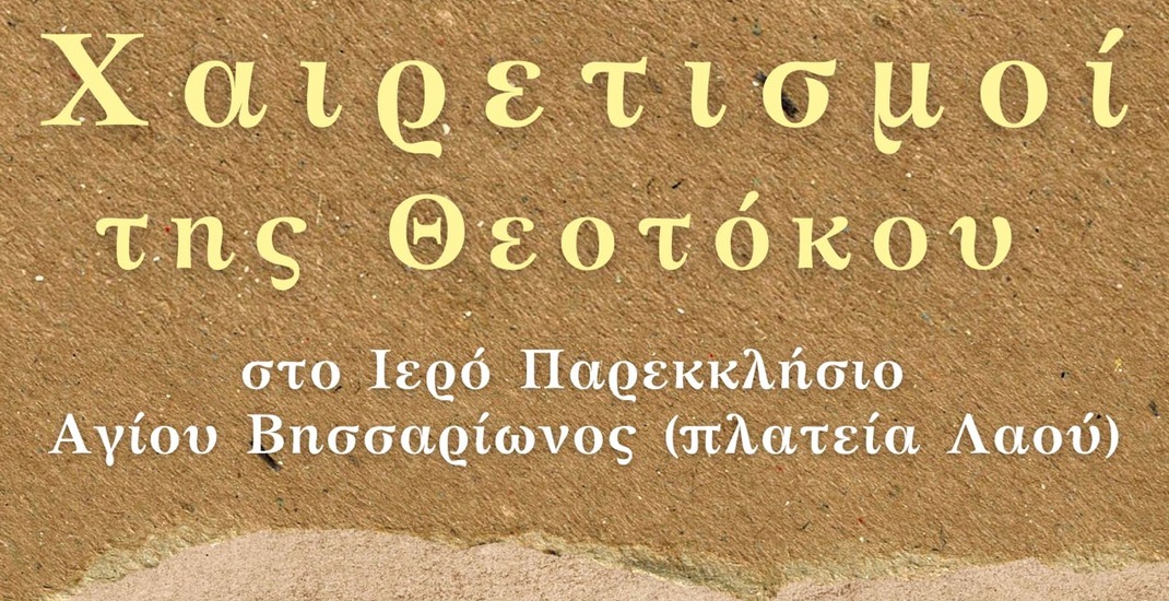 Κάθε Παρασκευή, στην περίοδο της Αγίας και Μ. Τεσσαρακοστής, θα τελούνται δύο (2) Ακολουθίες Χαιρετισμών προς την Υπεραγία Θεοτόκο στο Ιερό Μητροπολιτικό Παρεκκλήσιο του Αγίου Βησσαρίωνα, στην πλατεία Λαού, σύμφωνα με το ακόλουθο πρόγραμμα: